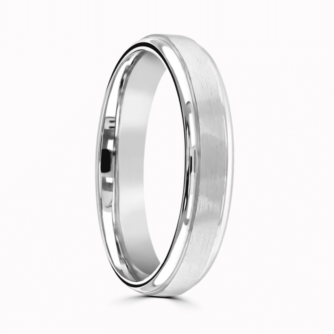 The “Arlo” gents 5mm flat court band. Modern contemporary style ring. Satin finish centre with a pattern design and polished edges.