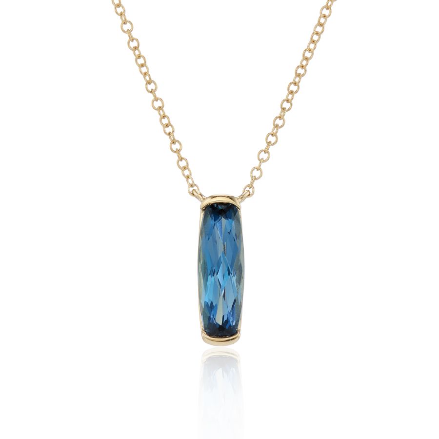 This elegant chain necklace features a London blue barrel-shaped topaz gemstone, celebrated for its stunning deep blue hue. The blue topaz hangs gracefully from a delicate yellow 9ct gold chain, creating a timeless piece of fine jewellery suitable for any occasion.