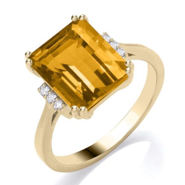 Stunning octagon cut semi-precious citrine with three brilliant cut diamonds on either side dress ring. Presented in a beautiful white luxury wooden box with LED light.